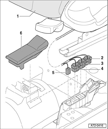 - Press in tab on connector for heated seat - 3 - on tunnel side and disconnect connector for heated seat - 3 -.