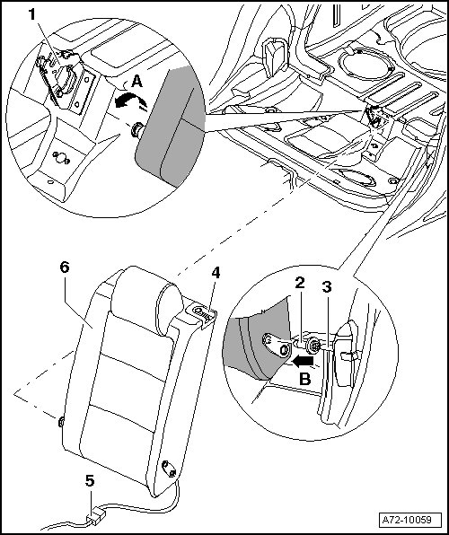 - Lift the backrest - 6 - in the direction of arrow - A - out of the center bracket - 1 - and remove it in the direction of arrow - B - from the fitting - 3 -.
