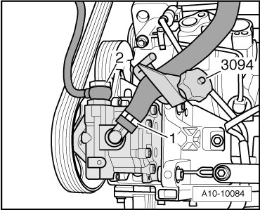 - Unbolt hydraulic pressure line - 2 - at power steering pump and set it aside on top of the longitudinal member.