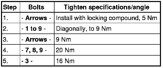 - Remove bolts - 1 through 9 - and then remove the lower cover for the timing chain from the bond.