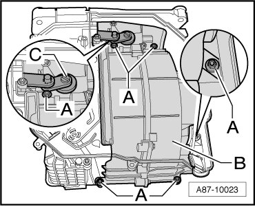 - Remove the Fresh Air Blower (V2) - B - carefully. Be sure not to bend the connecting element - C -.