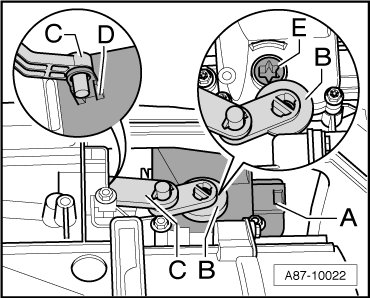 • Control motor shaft - E - does not have a stop, it rotates continuously when voltage is applied to terminals 5 and 6 on the control motor connector - A -. Therefore, when actuator is removed, voltage is only to be applied if connecting element - B - is attached.