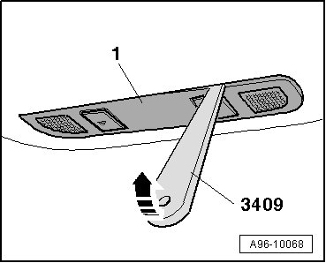- Carefully pry off interior/reading light - 1 - out of headliner opening - arrow - using (3409).
