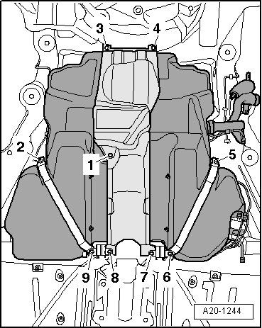 - Remove right rear cover - 1 - on bottom of vehicle floor.