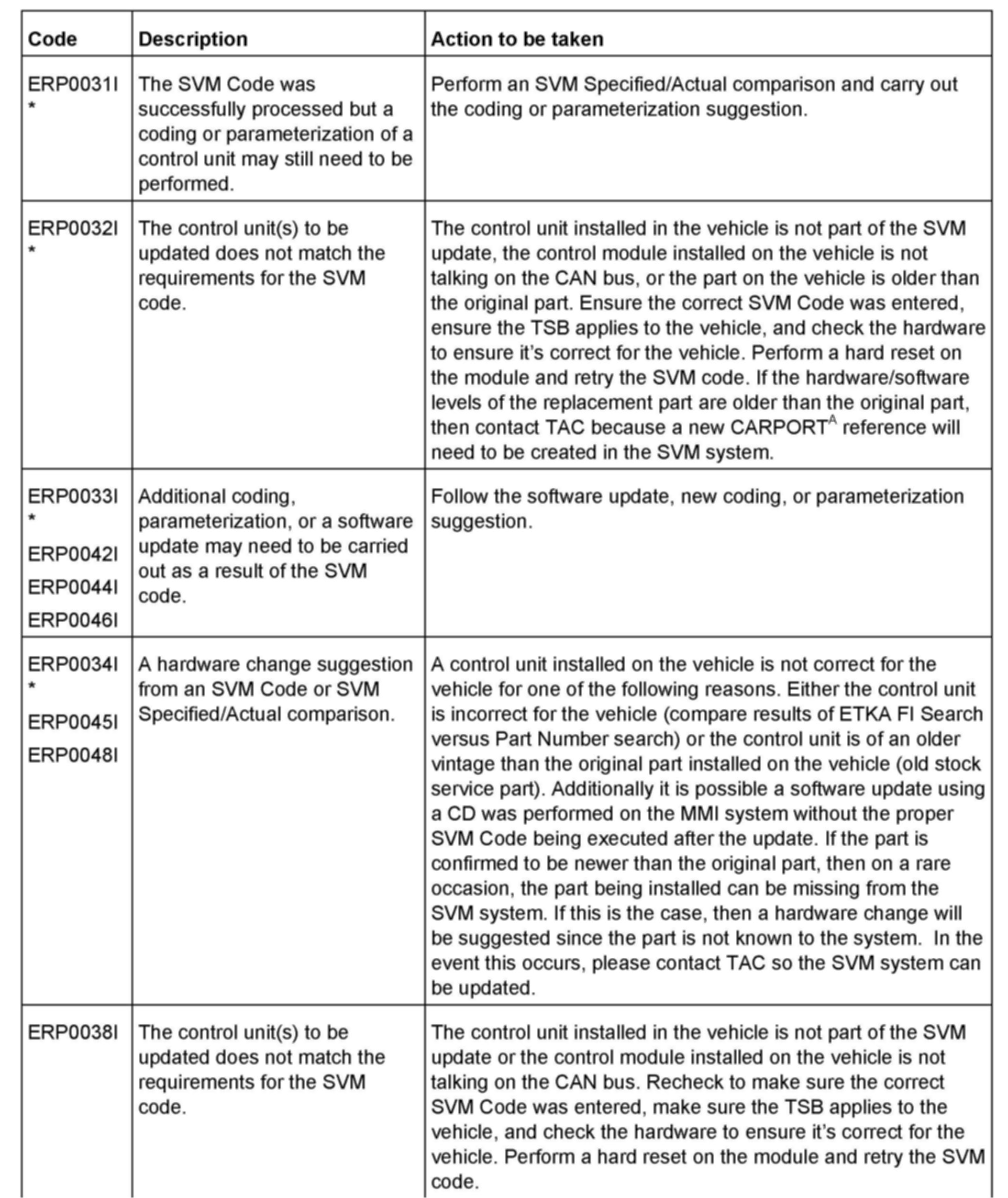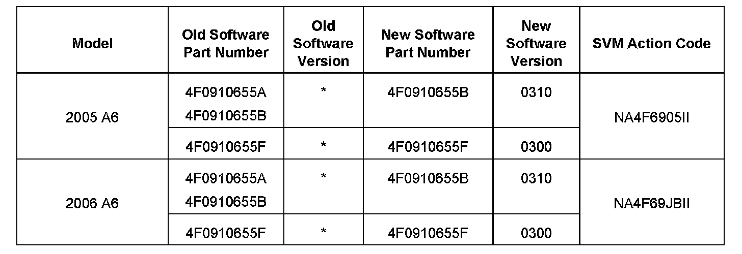 3. Update software for airbag control module (J234) using the SVM action code as listed in the table below if necessary.