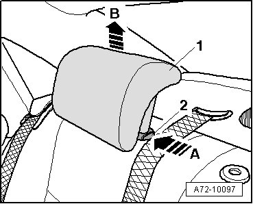 - Push release button - 2 - in - direction of arrow A - and pull headrest - 1 - upward as far as possible - arrow B -, keep release button pushed while doing so.