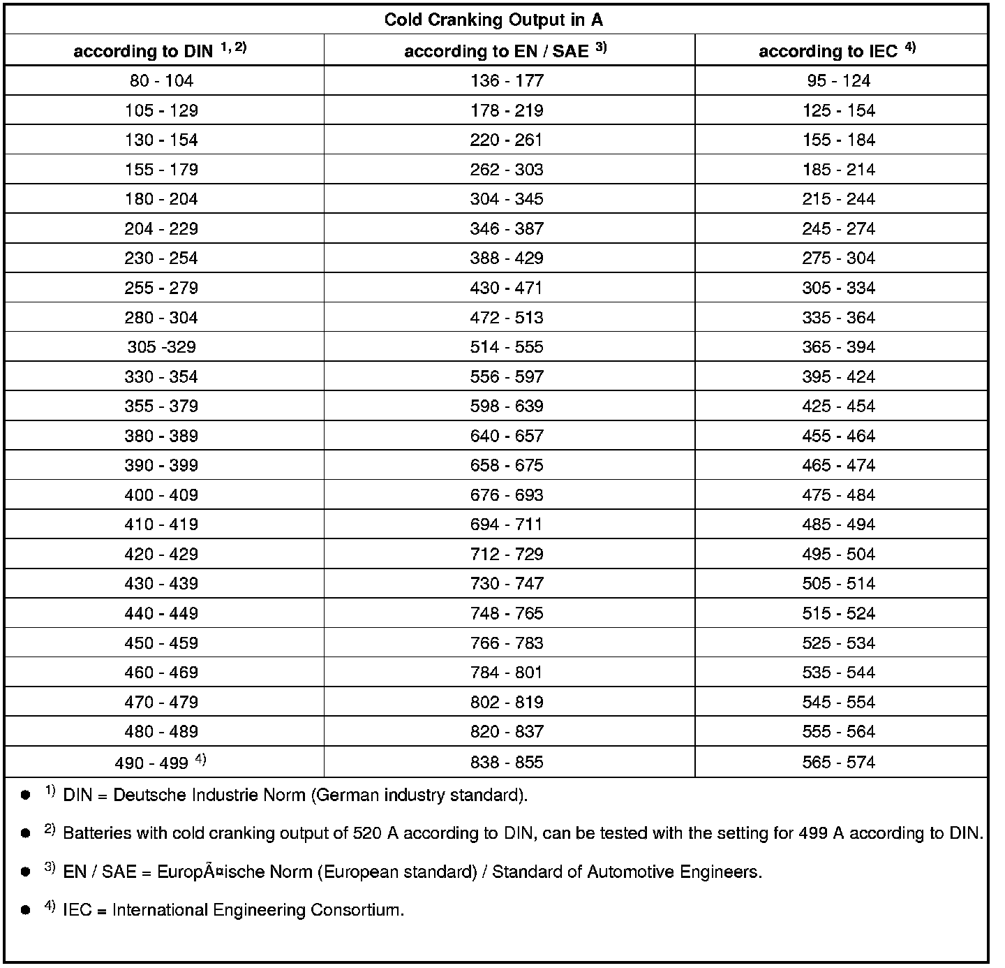 Batteries with cold cranking output of 520 A according to DIN can be tested with the setting for 499 A according to DIN.
