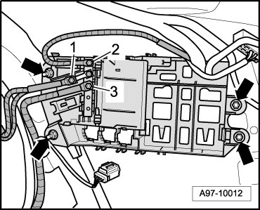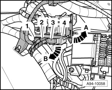 - Release retaining springs - arrows A - and pull comfort system central control module (J393) downward out of relay and fuse panel - arrow B -.