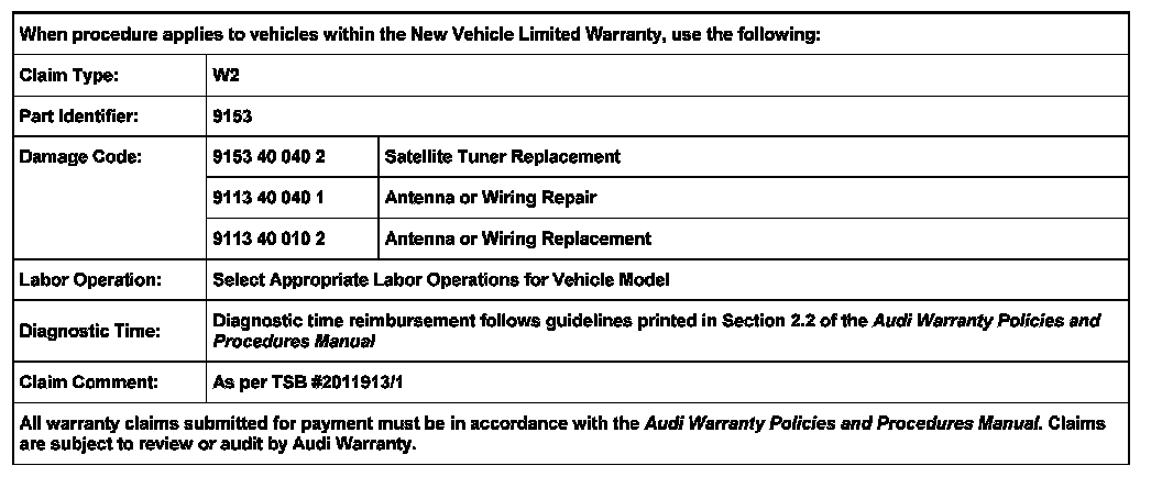 1. Verify in ETKA, ElsaWeb, Technical Bulletin 2011760 or the Satellite Tuner Matrix in AccessAudi that correct Satellite Tuner is installed.