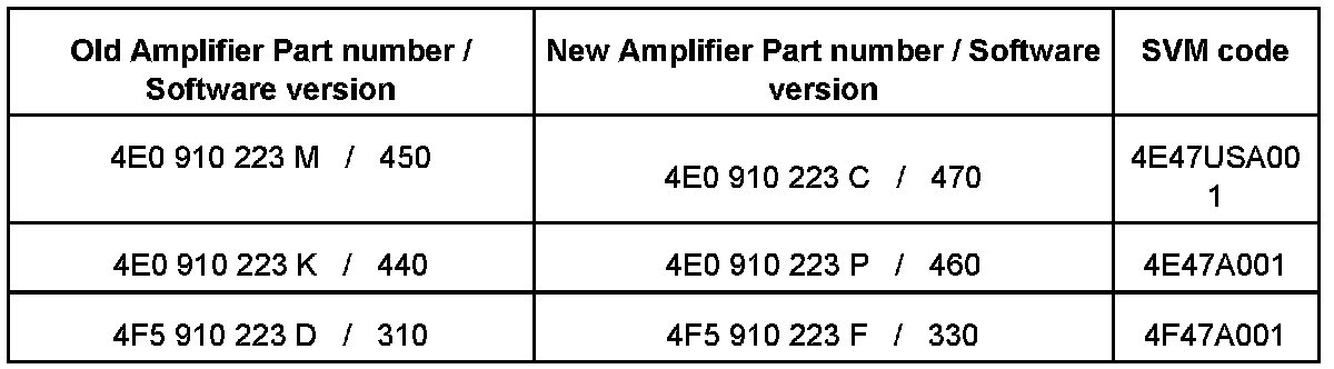 10. Verify the new software part number in the amplifier (Adr. Word 47), erase all sporadic fault codes and perform the SVM Update with the SVM codes above.