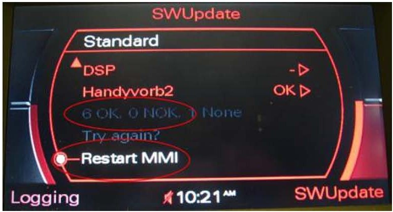 If all necessary components are updated (0 NOK) select Restart MMI to reset the MMI system.