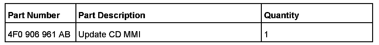 If the sound returns or the noise disappears and Software Version 0140 is verified in the BOSE Amplifier J525 (Address word 47), an MMI System - Update has to be performed. Therefore use Update CD 4F0 906 961 AB, which can be obtained in the ETKA parts catalog.