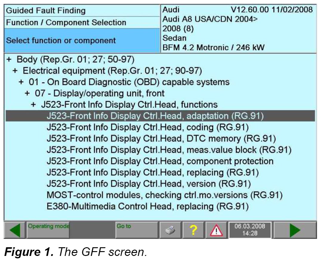 1. Perform "Guided fault finding / Guided function" and run "J523-Front Info Display Ctrl.Head, adaptation (RG.91)".