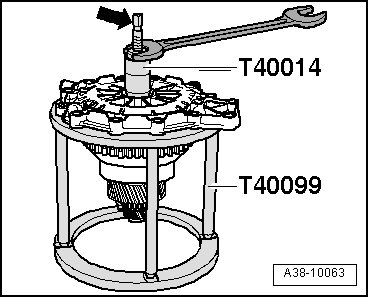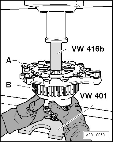 - Place input shaft - B - on Thrust plate (VW 401).