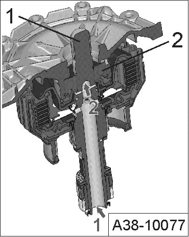 - Cool the hallow shaft, for example with ice spray, through the opening - arrow 1 - for the removed oil pipe - 1 - on the inner bearing seat - arrow 2 - - 2 - (transmission input shaft ball bearing).