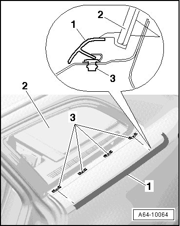- Remove the trim molding - 1 - from C-pillar beginning at clips - 3 - below side window molding - 2 -.