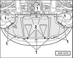 - Unfasten quick-release fasteners -1-, screw out bolts -2- and detach noise insulation.