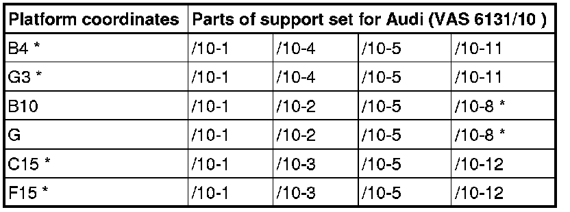 - Equip scissor lift platform (VAS 6131 A) with support set for Audi (VAS 6131/10) as follows: