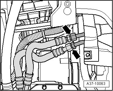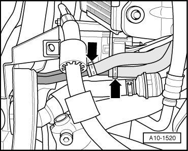 - Disconnect lower coolant hose from radiator - arrow - and drain residual coolant.