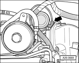 - Disconnect hose - arrow - for Secondary Air Injection (AIR) pump at air filter housing, press release buttons to do so.
