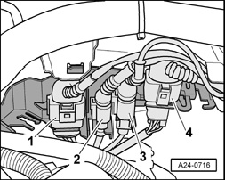 - Disconnect the electrical connector from the Engine Coolant Level (ECL) Warning Switch F66 and set aside coolant reservoir with coolant hoses - 1 - and - 2 - connected.