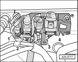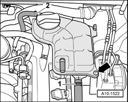 - Disconnect the electrical connector from the Engine Coolant Level (ECL) Warning Switch F66 and set aside coolant reservoir with coolant hoses - 1 - and - 2 - connected.