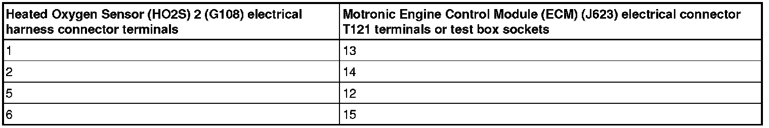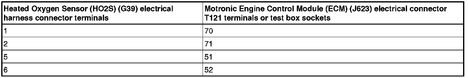 - Using a Multimeter, check the Heated Oxygen Sensor (HO2S) (G39) or the Heated Oxygen Sensor (HO2S) 2 (G108) electrical harness connector terminals to the Motronic Engine Control Module (ECM) (J623) electrical harness connector T121 terminals for an open circuit.