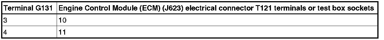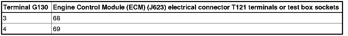 - Using a Multimeter, check the Oxygen Sensor (O2S) Behind Three Way Catalytic Converter (TWC) ( G130) electrical harness connector terminals to the Motronic Engine Control Module (ECM) (J623) or Oxygen Sensor (O2S) 2 Behind Three Way Catalytic Converter (TWC) (G131) electrical harness connector T121 terminals for an open circuit.