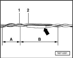- When repairing, both wires to the airbag igniters must be the same length. When twisting the wires - 1 and 2 - together, the - A - = 20 mm routing length must be maintained.