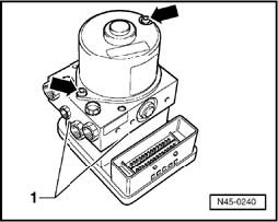 - Unscrew bolts at hydraulic unit - arrows - and take out hydraulic unit and control module.