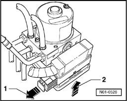 - Release control unit connector - arrow 1 - and unplug - arrow 2 -.