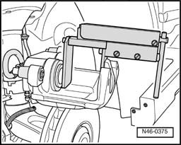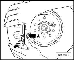 - Locate retaining spring at bottom of brake carrier. Then press retaining spring in direction -A- first, hold in this position and at the same time press into bore in brake caliper.