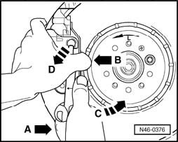 - Pull bottom of retaining spring in direction - A - and hold in this position. Push top of retaining spring in direction - B -. At the same time, turn spring slightly counter-clockwise and pull it out of bore in caliper - arrow D -.