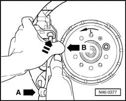 - Locate retaining spring at top of brake carrier. Press top of retaining spring in direction -B-, and at the same time hold bottom of spring by exerting pressure in the opposite direction -A-. Now push retaining spring into bore in brake caliper.