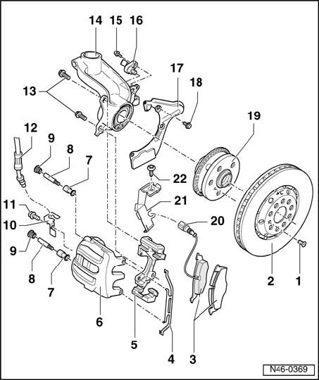 ^ Apply Brake pedal handle V.A.G. 1869/2 before removing a brake caliper or disconnecting a brake hose from the caliper.