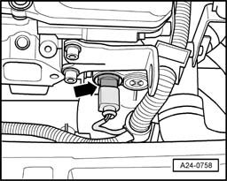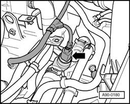 Engine Coolant Temperature (ECT) Sensor -G2- -arrow- is located in the coolant flange/thermostat housing in cylinder head. Sensor is integrated with Engine Coolant Temperature (ECT) Sensor -G62-.