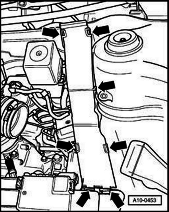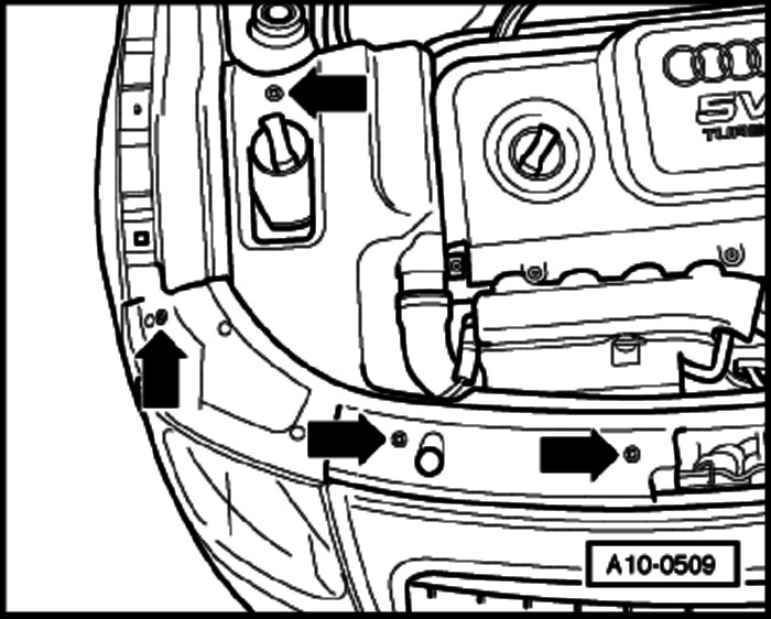 - Remove noise insulation panels (center, left and right) (arrows).