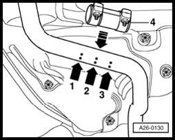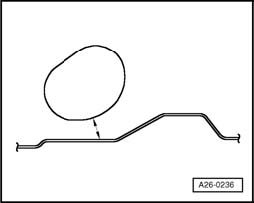 - Using body repair saw, e.g. V.A.G 1523, cut exhaust pipe at separating point - arrow 2 - at right angle.