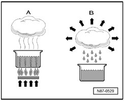 When water is heated in a vessel (heat absorption), water vapor can be seen to rise. If the vapor is further heated through heat absorption, the visible vapor turns into invisible gas. The process is reversible. If heat is extracted from water in gaseous form - A - it changes first to vapor - B -, then to water and finally to ice.