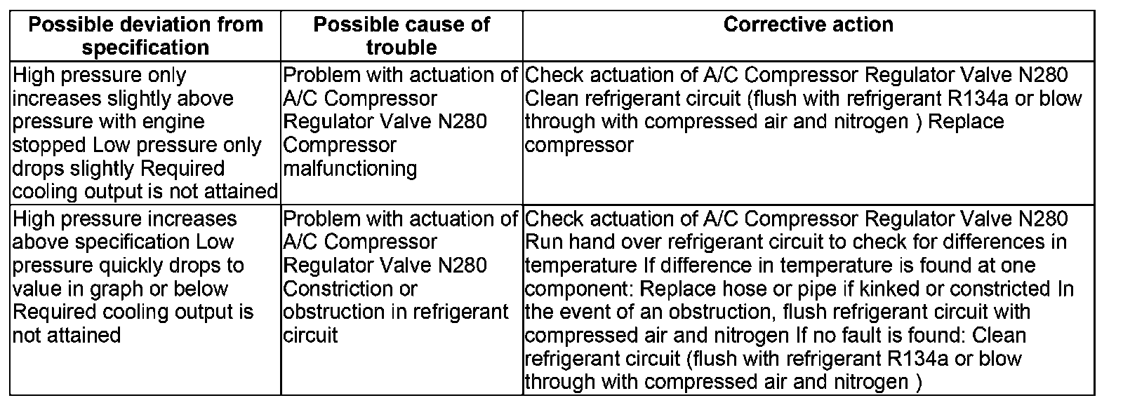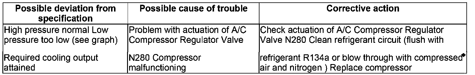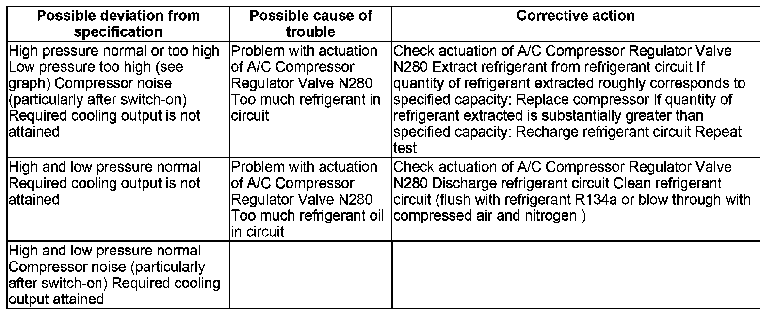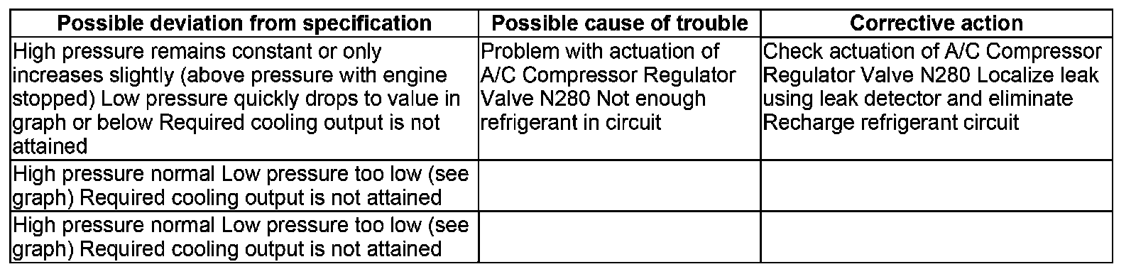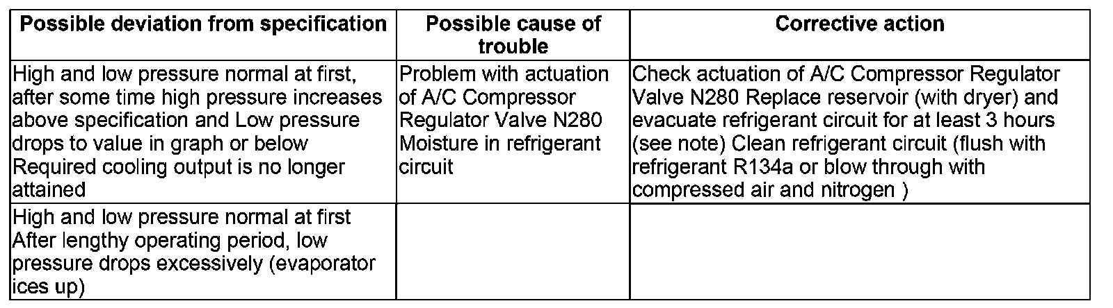 NOTE: Pay attention to the following as regards fault High pressure normal, low pressure too low" : This fault may lead to icing-up of evaporator although quantity of refrigerant in circuit is OK. Check measured values of Evaporator Vent Temperature Sensor G263 and actuation of A/C Compressor Regulator Valve N280. If measured value of Evaporator Vent Temperature Sensor G263 is incorrect, evaporator may ice up or cooling output is not attained, air conditioner Guided Fault Finding function.
