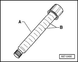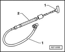 - Insert tube VAS 6201/8 (item - 7 - ) in service coupling and open service coupling by screwing in handwheel. Hold hose upwards and screw in toggle of hand pump until leak detection additive starts to emerge from tube.