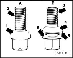 B - Two-part wheel bolt. Lightly lubricate threaded area - 3 - as well as between bolt head contact surface - 6 - and spherical cap ring - 5 -. The spherical cap to wheel (rim) contact surface - 4 - must not be lubricated.
