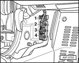Left connector station -arrow- is located in left footwell beneath A-pillar trim
