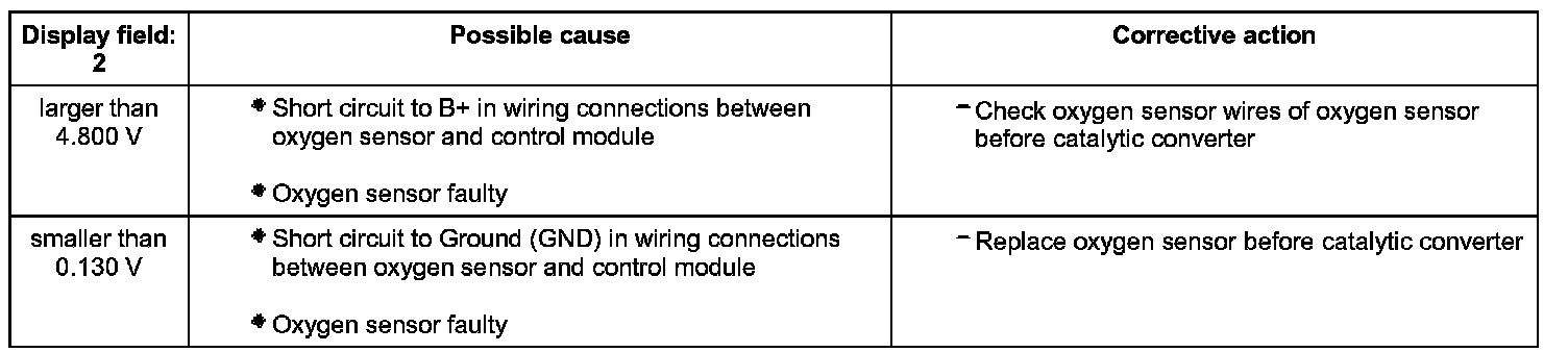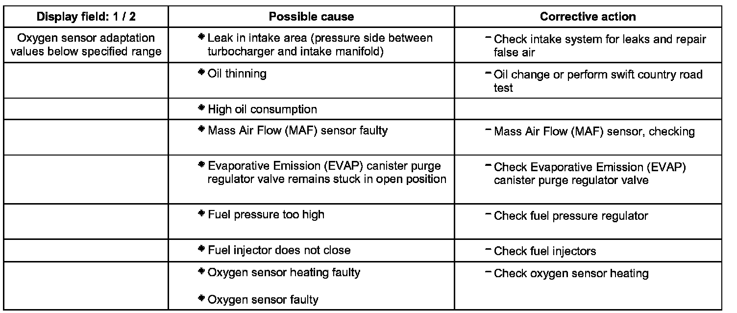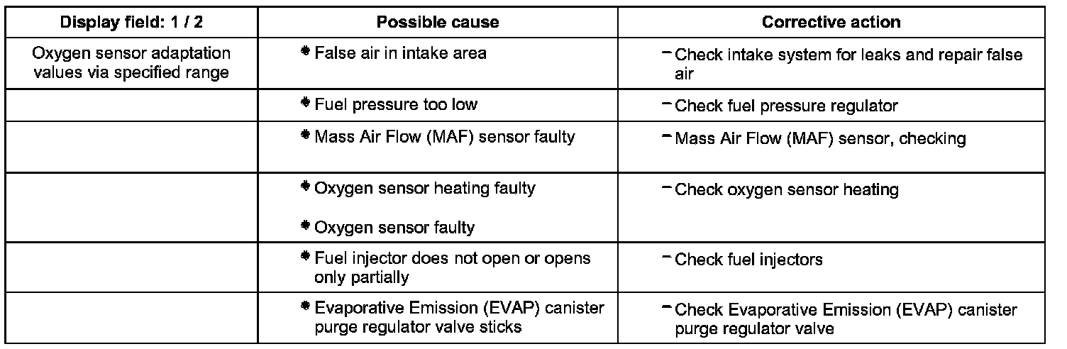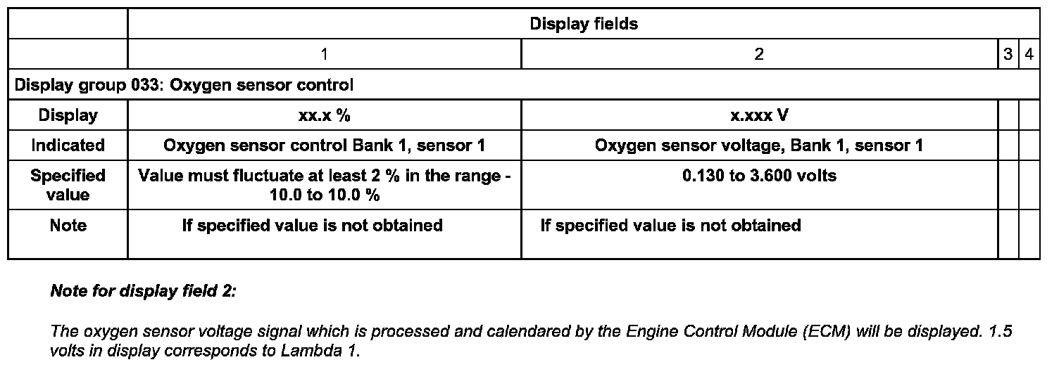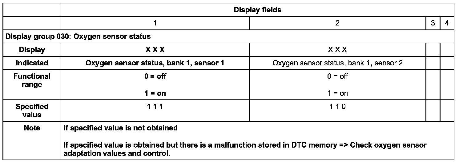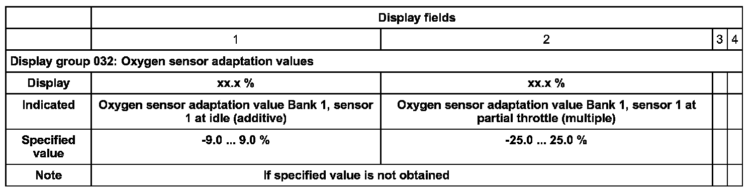 - Check oxygen sensor adaptation values in display fields 1 and 2.