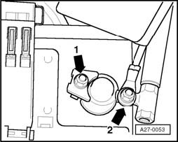 - Tightening torque for battery clamps -arrow 1-: 6 Nm.