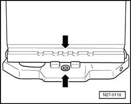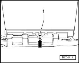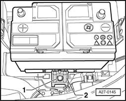 - Install battery so battery carrier lug -arrow- engages in battery foot strip cut-out -1-.