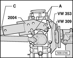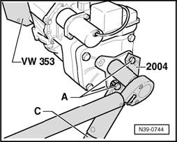 Note: When loosening hex nut, counter hold flange / drive shaft over tube - C - using transmission holder 2004 (2nd technician).