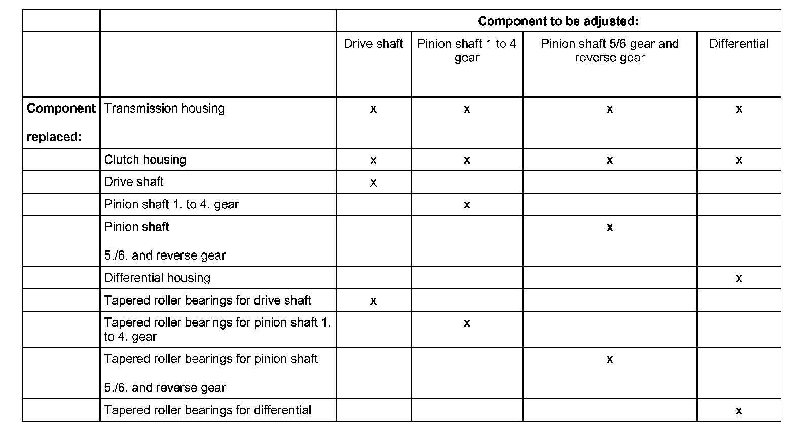 Note: If repairs have been carried out on the transmission, it is only necessary to adjust the drive shaft, pinion shaft 1. to 4. gear, pinion shaft 5/6 and reverse gear or differential gear if components have been replaced that directly influence the final drive adjustment. To avoid unnecessary adjustments, refer to the following table: