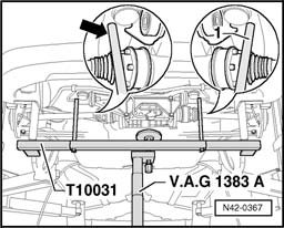 - Lower rear axle slowly using transmission jack, e.g. V.A.G 1383A.