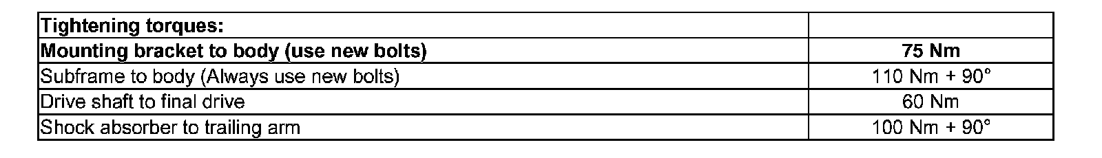 - Tighten bolts for subframe and mounting brackets onto installation position as marked.